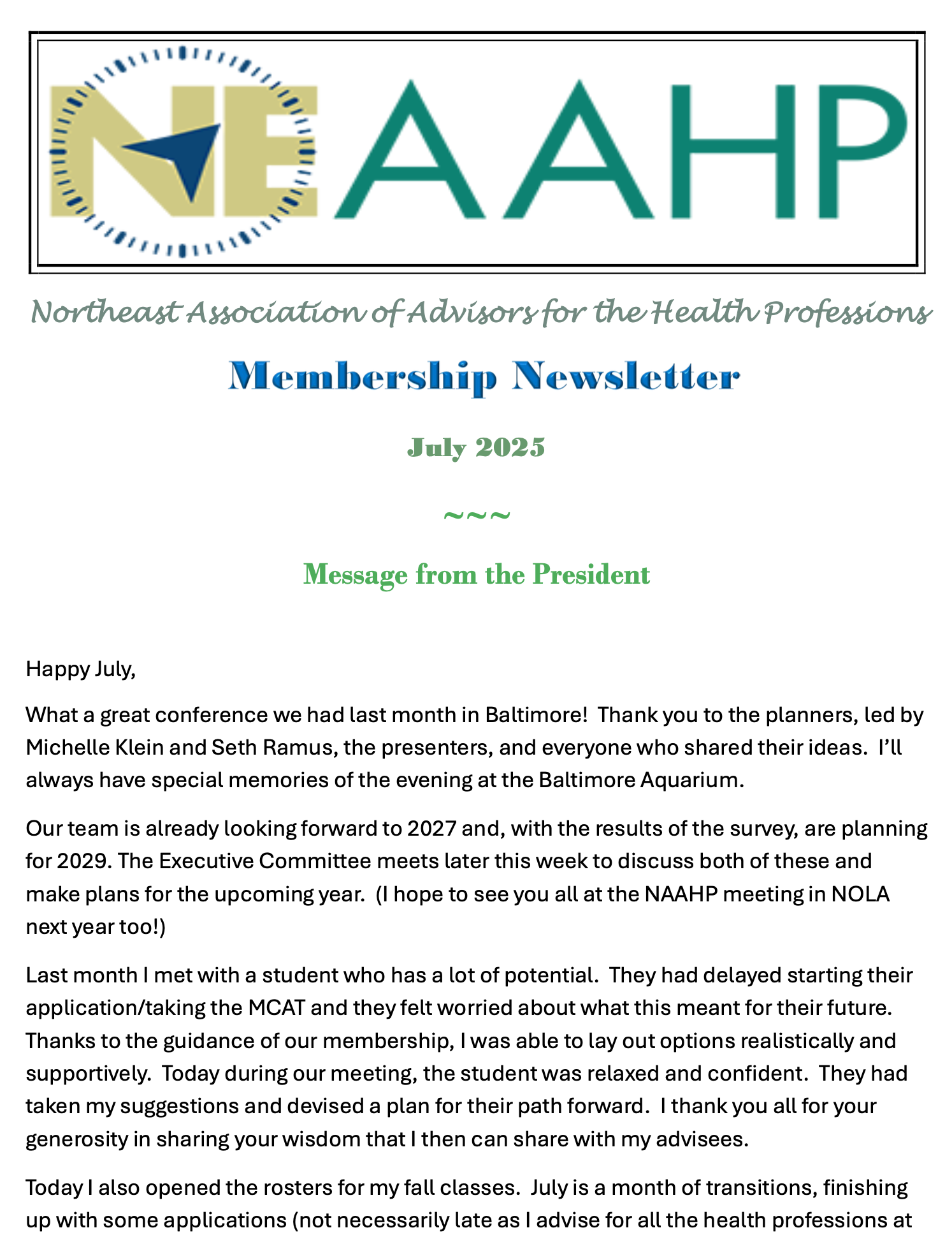 NEAAHP, along with CAAHP, SAAHP, and WAAHP, are the four regional associations that comprise the National Association of Advisors for the Health Professions.